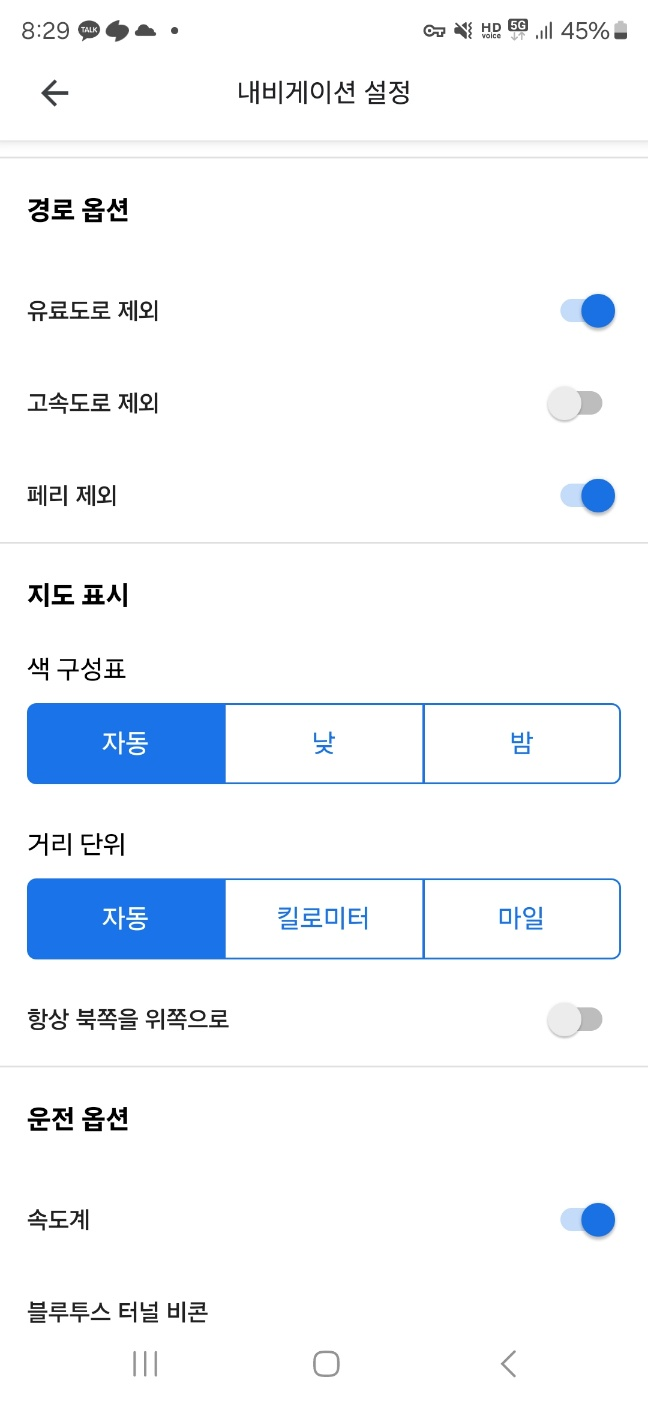 유료도로, 페리 제외를 켜둡니다.